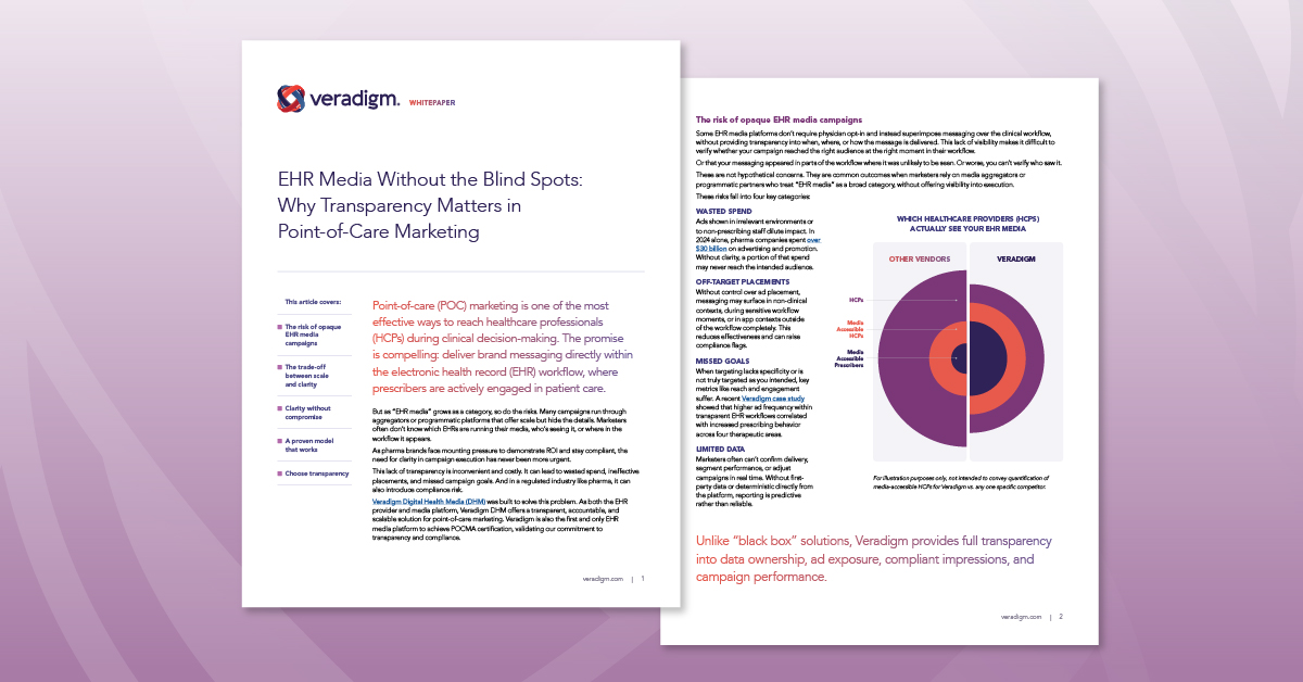 Our whitepaper, EHR Media Without the Blind Spots: Why Transparency Matters in Point-of-Care Marketing, explores why transparency is critical in today’s healthcare environment and how Veradigm Digital Health Media (DHM) is leading the way with solutions that prioritize clarity, accountability, and measurable impact. Gain insights into the risks of opaque practices, the growing demand for transparency among providers and patients, and the steps you can take to safeguard your reputation while improving campaign performance.